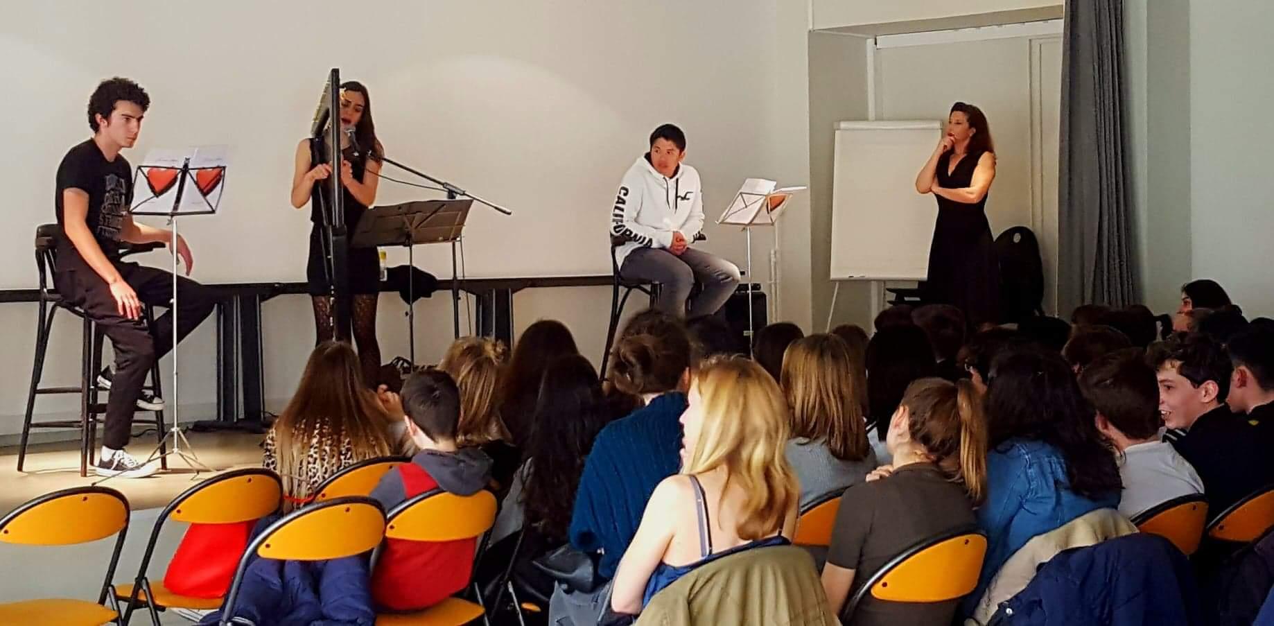 La compagnie Alcantara, représentée par Isabelle Bondiau-Moinet, Aliénor de Georges, Pascal Renault, sont intervenus dans 3 établissements scolaires de Nice, Don Bosco, Estienne d’Orves et Le Parc Impérial avec un extrait de la lecture musicale de ‘Je vous aime’.